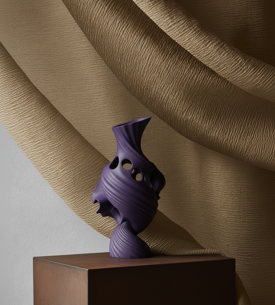 Aperlai Vasoria embodies the spiraling power and sheltered inner world of Lycia's strategic port city within a single form. Its spiral body draws inspiration from the native Murex shells and elegantly conveys the fluid rhythm of the sea. Circular spaces recall the city's defensive walls, while the compact silhouette symbolizes the harbor's power and commercial prosperity. The deep hue of Tyrian Purple gives the work a refined character; the contrast between the grooved surfaces and the voids emphasizes its sophisticated presence.
