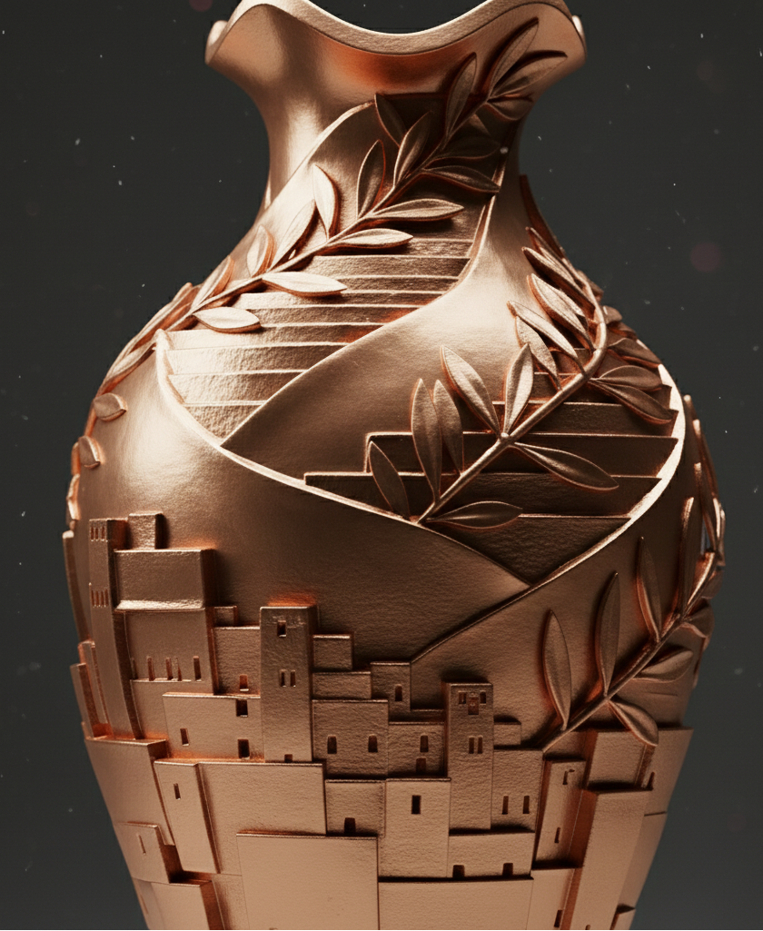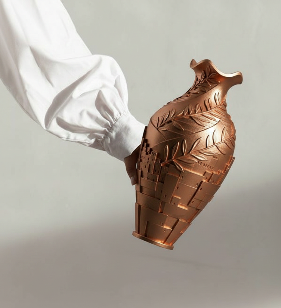 Arycanea Vasoria combines the vertical stability and layered urban fabric of its high-altitude architecture within a single form. The lower body, with its geometric segments, echoes the city walls and hillside dwellings, while the stepped lines of the upper sections convey the layout of theater and temple ruins. Finely embossed olive branches symbolize the balance of nature and the fertility of Lycia. The form offers an elegant representation of peace and permanence.