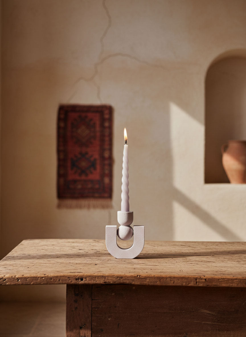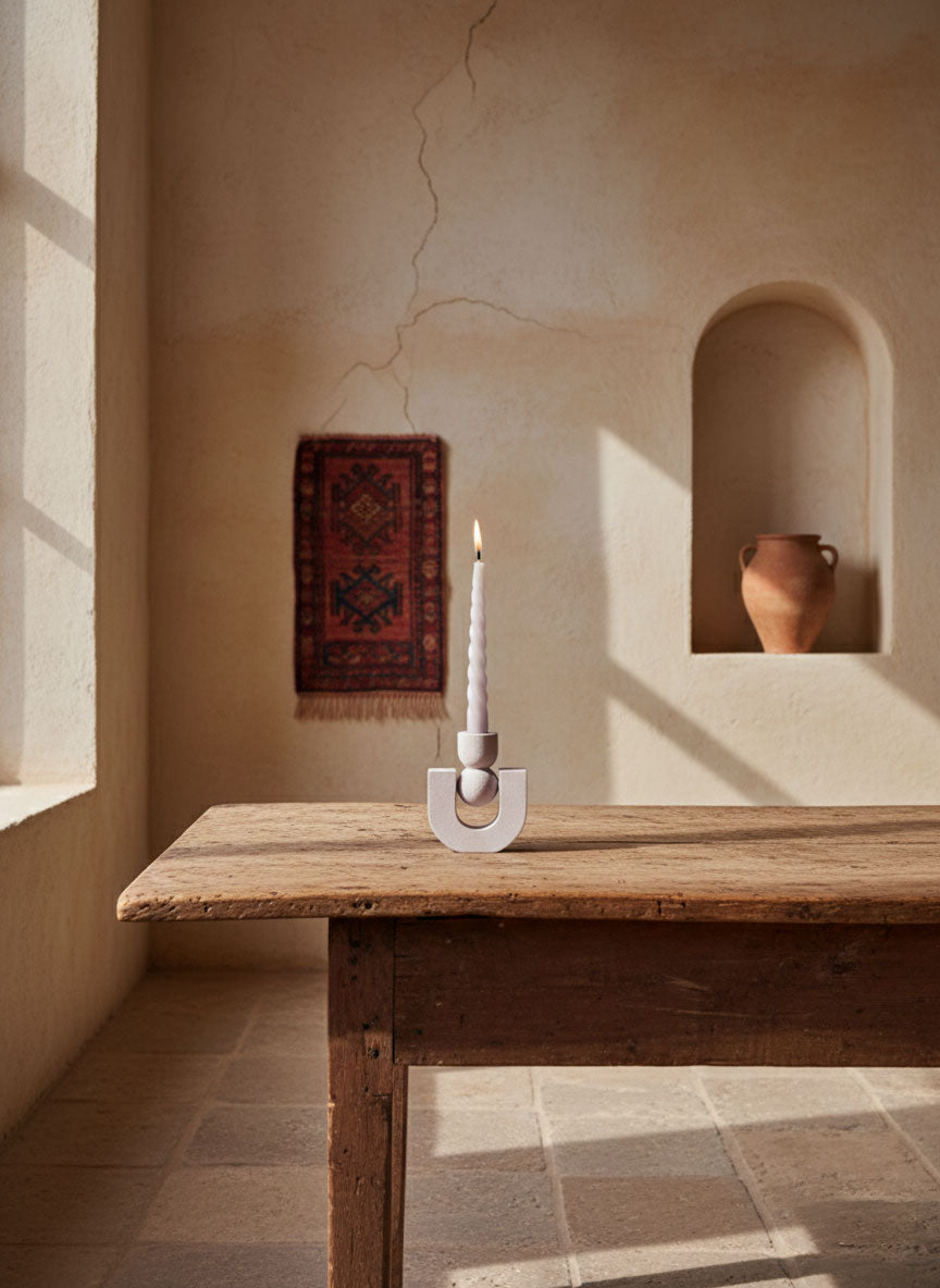 Negatif boşluk hâlâ formun merkezinde yer alır; ancak artık bastırılmış değil, yönlendirici bir rol üstlenir. Mat yüzeyler, hacimdeki artışı görsel bir gürültüye dönüştürmeden taşır. Işık, yükselen eksen boyunca yumuşak geçişlerle ilerler; gölge, objenin mekânla kurduğu ilişkiyi sakin bir akışla tamamlar.
